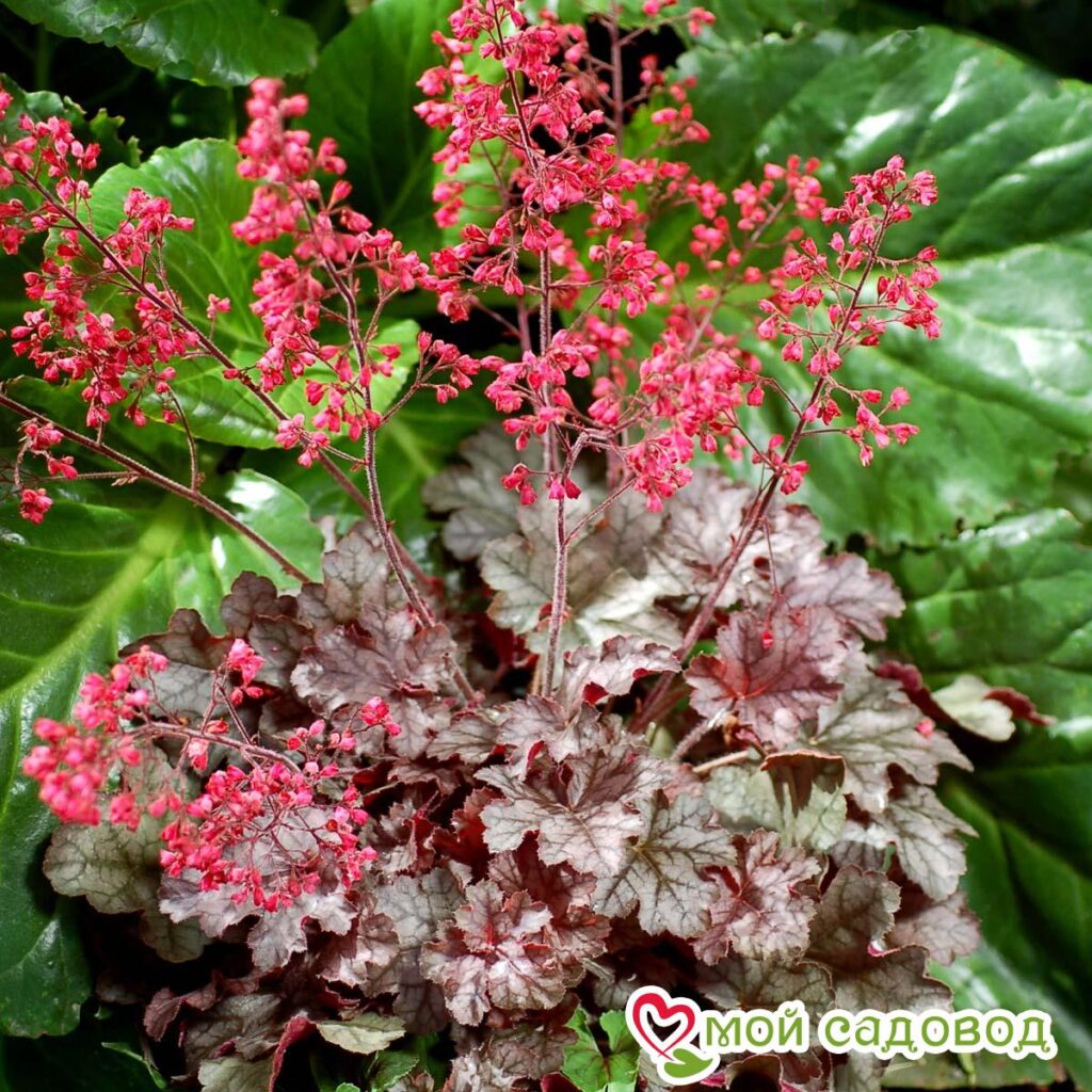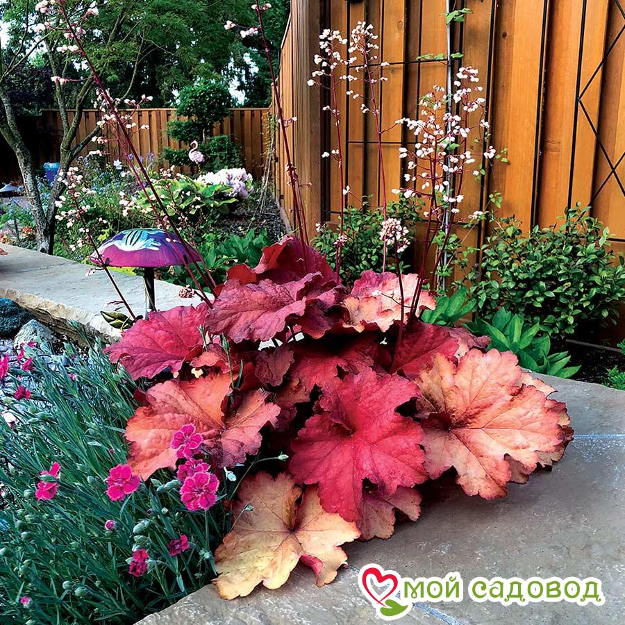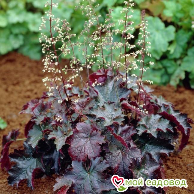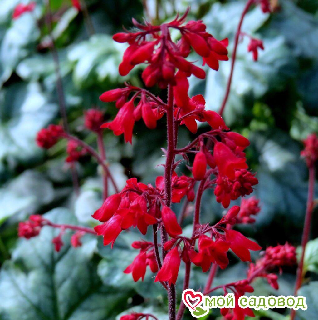 Экзотическая культура родом из Америки. Это невысокие кусты, достигающие 50 см в высоту. Особое внимание привлекают роскошные листья. Они широкие, мясистые, гофрированные, зубчатой формы. В зависимости от сорта окрас может быть желтый, черный, зеленый, янтарный, бордовый и даже серебристый. Цветение гейхеров длится все летние месяцы до начала заморозков. Цветки колокольчатой формы, собранные в кисти. Лепестки окрашены в красный, белоснежный, розовый или бежевый цвет.