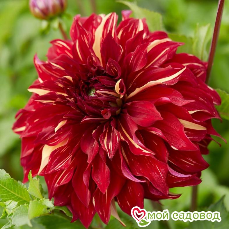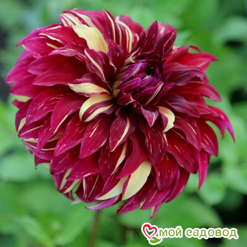 Взрослый куст достигает в высоту 140 см. Состоит он из прочных прямостоячих стеблей. По всей длине стебли покрыты гладкими, глянцевыми, зелеными листьями. Цветок крупный, махровый, шаровидной формы. В полном роспуске его диаметр составляет 25 см. Лепестки широкие и плоские. По краям они немного закручены и похожи на язычки. Окрас двухцветный: на бордовом фоне просматриваются желтые полоски.