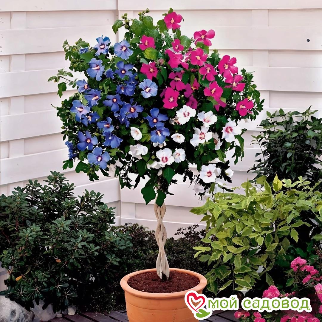 Гибискус-дерево Триколор — настоящая находка для тех, кто хочет добавить в свой сад ярких красок и оригинальности. Представьте: стройное деревце с ярко-зелёной кроной, усыпанное цветами самых невероятных оттенков — от нежно-розового до огненно-красного, от солнечного жёлтого до глубокого фиолетового. И каждый цветок — уникален! Этот гибискус не просто украшает сад, он создаёт в нём атмосферу праздника и радости. Основные характеристики Гибискуса-Дерева Триколор: Разнообразие окрасок цветков: главная особенность этого сорта — его пёстрое и разнообразное цветение. Каждый цветок может иметь свой уникальный оттенок, что создаёт неповторимый колорит в саду. Ярко-зелёные листья: яйцевидные листья ярко-зелёного цвета служат прекрасным фоном для ярких цветков и создают ощущение свежести и зелени даже в самый жаркий день. Возможность выращивания в виде штамбового деревца: это позволяет придать растению более изысканный и оригинальный вид. Штамбовая форма идеально подходит для небольших садов и для выращивания в контейнерах на террасах и балконах. Размер цветка: Цветки гибискуса-дерева Триколор крупные, достигают 10-15 см в диаметре, что делает их ещё более заметными и привлекательными. Высота растения: в зависимости от формирования и условий выращивания высота растения может достигать 1-2 метров. Период цветения: Гибискус-дерево Триколор цветёт с весны до осени, радуя своим обильным и продолжительным цветением. Другие характеристики: Растение хорошо переносит обрезку, что позволяет формировать крону по вашему желанию. Преимущества покупки саженцев в интернет-магазине “Мой Садовод”: Уникальные и эксклюзивные саженцы: мы предлагаем вам возможность купить редкий и востребованный гибискус-дерево Триколор, который станет настоящей изюминкой вашего сада. Высокое качество посадочного материала: все наши саженцы выращены в нашем собственном питомнике с использованием современных технологий и под строгим контролем квалифицированных специалистов. Тщательная упаковка: мы заботимся о том, чтобы ваши саженцы прибыли к вам в целости и сохранности. Каждый экземпляр тщательно упаковывается с использованием специальных материалов, обеспечивающих защиту от повреждений во время доставки. Доступные цены: мы предлагаем купить качественные саженцы гибискуса-дерева Триколор по выгодной цене. Мы стремимся сделать красоту доступной для всех садоводов! У нас вы найдёте одни из самых недорогих предложений на рынке. Оперативная и надежная доставка: мы осуществляем оперативную доставку заказов почтой и проверенными транспортными компаниями по всей России. Вы можете заказать саженцы, не выходя из дома, и получить их в кратчайшие сроки. Профессиональная консультация: наши опытные специалисты всегда готовы ответить на ваши вопросы и помочь с выбором растений, а также дать полезные советы по посадке и уходу. Более 10 лет успешной работы: мы успешно работаем на рынке садоводства более 10 лет и заслужили доверие тысяч клиентов. Наш питомник — это гарантия качества и надёжности! Гарантия соответствия сорту: мы гарантируем соответствие саженцев заявленному сорту и высокую жизнеспособность растений. История сорта “Гибискус-Дерево Триколор”: К сожалению, точная информация о происхождении сорта «Гибискус-Дерево Т