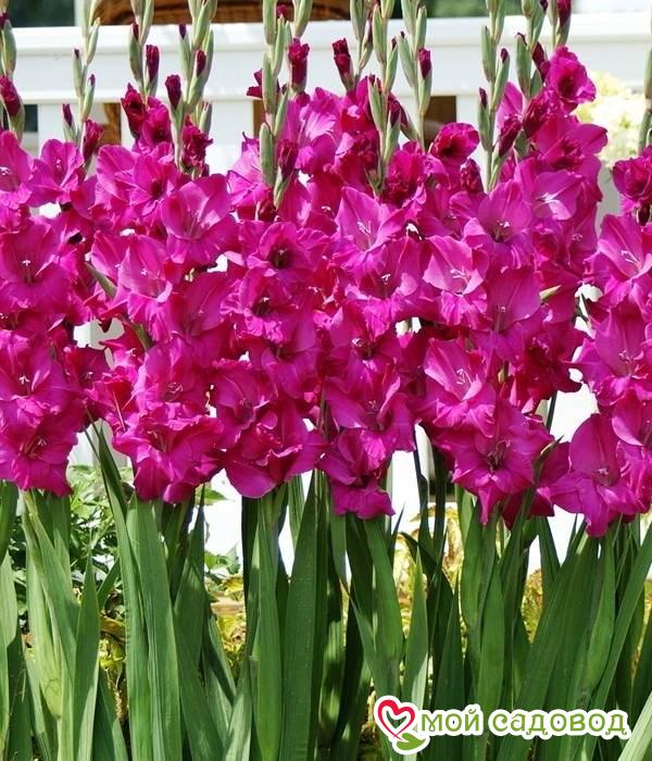 Луковицы гладиолуса крупноцветкового Фиделио (Fidelio) предназначены для высадки в цветники романтического дизайна. Насыщенный сиренево-розовый оттенок бутонов наполнит композицию нежной яркостью и сочной жизненной энергией. Сорт Фиделио гармонично сочетается с белыми и желтыми цветами, а так же с пестролистными декоративными растениями. Высота гладиолуса достигает 1 метра, размер цветоноса от 50 до 70 сантиметров. Цветки крупные, формой напоминают соцветие мальвы. Цвет яркий, розовый с сиреневым оттенком, в горловине цветка присутствует малиновое пятно. Цветение позднее – с августа по сентябрь. Одновременно на кусте раскрываются до 10 бутонов. Посадка. Из-за погодно-климатических особенностей в разных регионах России сроки посадки отличаются: На Юге (Краснодарский край (Кубань), Северный Кавказ) — сажать можно уже в конце апреля. В Средней полосе (в т. ч. Подмосковье) — оптимальное время приходится на начало или середину мая. В Сибири, на Урале, в Ленинградской области — в середине или конце мая. Места посадки должны быть солнечными, без сквозняков и с качественно дренированной почвой. Затенённые участки плохо сказываются на развитии культуры. Однако в южных районах небольшое затенение допускается. Глубина высадки луковиц обычно составляет 8-10 см (для мелких), 10-15 см (для крупных). Полив. Средняя частота поливов культуры составляет раз в неделю, а летом, в жаркие дни, один раз в 3-4 суток. Поливают утром или вечером, используя около 10-12 л воды на 1 м2. Полив производят в специально подготовленные междурядные борозды, углублённые до 30-50 мм с тем, чтобы капли воды не попадали на листики гладиолусов. Без регулярного полива цветы быстро завянут. По завершении процедуры кусты окучивают. Раз в декаду обязательно производят рыхление почвы.