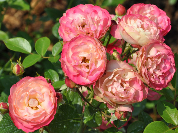 Sparkle & Shine (Christian Bédard, 2013) Описание сорта: Как у любой розы, у этой главное достоинство — её цветки. Их «изюминка» заключается в том, что окрас лепестков меняется не только в зависимости от возраста (эта черта типична для многих роз), но также от условий выращивания: почвы и погоды. Только распустившиеся цветки, своей формой напоминающие пион, имеют розовый окрас. Но вскоре он начинает меняться, в нём появляется нежный кофейный оттенок. Если погода сухая и тёплая, «кофейность» выражена сильно, вплоть до пепельности. Но в прохладные, дождливые дни розоватость остаётся, а по краям лепестков даже усиливается. Почему именно роза Sparkle & Shine: Можно выращивать как на клумбах и бордюрах, так и в контейнерах. Цветение очень обильное Высокая устойчивость к болезням