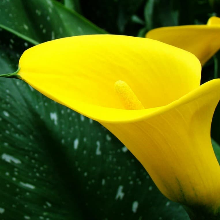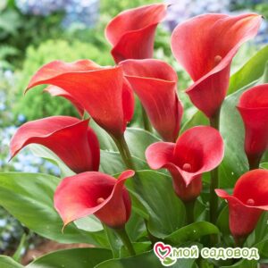 Калла Саншайн — формирует восковидный желтый бокал диаметром 7−8 см. Высота «покрывала» достигает 15 см. Рост в период цветения может составлять до 60 см.Растение формирует сразу несколько цветоносов. Охваченные крупными прикорневыми листьями стебли образуют подобие флористической композиции. Сорт отлично смотрится в срезке. Цветение май-август (в зависимости от срока высадки клубней). Количество цветков зависит от размера клубня, может быть от 3 до 10. ПОСАДКА М УХОД. Рано весной в горшки для комнатной культуры, в открытый грунт — после того, как минует угроза заморозков. Клубни сажают на глубину 5-10 см и хорошо проливают почву, поскольку каллы любят влагу. Для посадки каллы подойдет притененный участок. Идеальный вариант, место под негустыми кронами деревьев. Чтобы было достаточно светло, а солнечные лучи не обжигали листьев. Очень эффектно смотрятся каллы, рядом с искусственным водоемом. Отлично цветет и растет только в тепле, где температура не ниже 18°C, самая оптимальная температура 22-23°C. Не переносит сквозняков. Цветоносы этого растения высокие, которые идут прямо от низа растения. На открытом воздухе это прекрасное растение цветет 1 месяц, а в закрытом помещении — 14 дней. Осенью растения сбрасывают листья. На зиму клубни каллы нужно выкопать и хранить в непромерзаемом помещении.