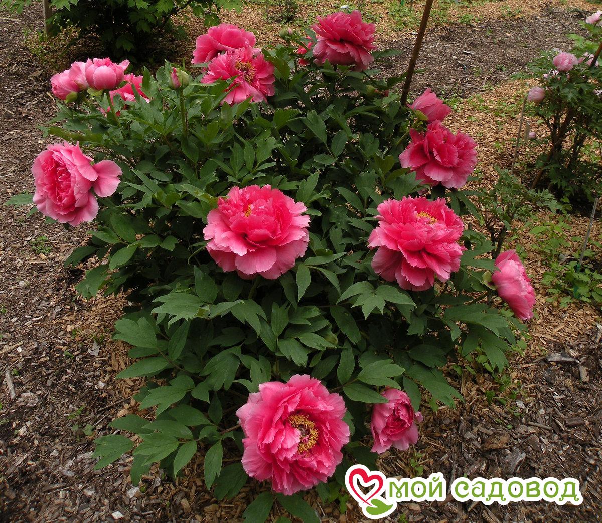 Коралловый Алтарь — цветки розово-кораллового цвета. Лепестки зубчатые, образуют плотные цветки диаметром до 20 см. Аромат легкий, сладковатый. Высота куста 120-150 см. Пионы сорта Коралловый алтарь (Shan Hu Tai) примечательны не только необычной окраской лепестков (от бледно-розового до насыщенного кораллового), но и причудливой формой листьев. Они не требуют укрытия на зиму, не предъявляют особых требований к уходу, устойчивы к болезням и вредителям. Пион древовидный — морозоустойчивый кустарник, достигающий высоты до 2 м, с крупными ярко-зелеными листьями. На одном кусте может быть от 30 до 70 цветков. Диаметр каждого от 20 до 25 см. Продолжительность цветения 12—14 дней. Растение декоративно и после цветения из-за необычной формы листьев. Пион неприхотлив, устойчив к болезням. На одном месте без пересадки может расти более 20 лет. Место посадки Для посадки пионов понадобится защищенное от ветров место с хорошей освещенностью. Сорта светлой окраски, а также пионы с простыми и полумахровыми цветками можно посадить на частично затеняемом участке, это продлит цветение и защитит цветы от выгорания. ХРАНЕНИЕ ДО ПОСАДКИ: После получения посылки, рекомендуем вскрыть пакет и осмотреть корневище. Почки должны быть плотные и розового цвета. Так же уделите внимание самому корневищу, все сомнительные, потемневшие, сморщенные части удалите, а места среза обработайте зеленкой или залой. Если почки еще не тронулись в рост, а высаживать в открытый почву рано, советуем Вам хранить корневище в холодильнике, обязательно оставляя его в пакете с торфяной смесью или в коробке под снегом. Если почки успели раскрыться это не критично, сохранить до посадки их так же возможно, высадите корень пиона в большой просторный горшок или в любую другую ёмкость.