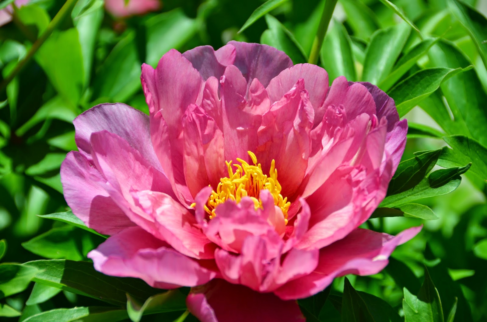 Период цветения пиона Дабл Пинк приходится на конец мая или начало июня. Цветение обильное. Растение образует крупные густомахровые бутоны, диаметром до 17 см. На фото лепестки цветов играют нежными оттенками розового цвета. У сердцевины, которая выделяется ярко-желтыми пыльниками, они темнее, а к краям приобретают молочные оттенки.