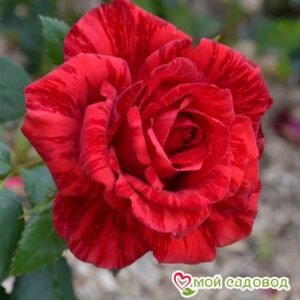 Цветки махровые, диаметром до 7 см, с нежным ароматом. Очень необычной и красивой окраски с впечатляющими переливами цветов — по мере распускания на белых цветках с красными подпалинами на краях лепестков появляются розовые потеки и красные штрихи. Цветение — обильное .Куст прямостоячий, ветвистый, высотой до 120 см, с густой, тёмно-зелёной, глянцевой листвой, очень устойчивой к заболеваниям. Цветение — обильное, листва — тёмно-зеленая, густая и очень блестящая.