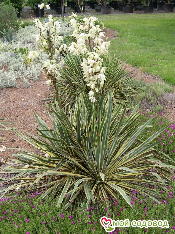 Юкка нитчатая Брайт Эдж – удивительный сорт, который завоевал сердца многих цветоводов. В 1993 году многолетник отмечен премией Award of Garden Merit (AGM). Сегодня купить недорого качественный посадочный материал можно в нашем интернет-магазине. Как выглядит растение? Это карликовый вечнозеленый многолетник, который цветет с конца июня по август. На поверхности грунта он формирует крупную розетку листьев. Листовые пластинки узкие и длинные (около 45 см). Окрашены они в сине-зеленый цвет. По краям проходит ярко-желтая кайма. Иногда она с примесью розово-малинового цвета. Цветки кремово-белые, колокольчатые, диаметром до 8 см. Как правило они собраны в высокие и пышные соцветия длиной 1 м. Плод – округлая коробочка шириной до 5 см. Корневая система хорошо развитая. Применение в ландшафтном дизайне Данный сорт подходит как для групповой, так и для одиночной посадки. Он будет хорошо смотреться в каменистых садах, широких бордюрах, рабатках. Многим нравится выращивать юкку в контейнере. Срезанные цветы отлично выглядят в букетах. Советы по посадке и выращиванию Выберите такое место для посадки юкки, в котором она будет получать достаточно солнечного света. В полутени растение тоже будет расти и цвести. Почва должна быть хорошо дренированной, чтобы корни не поразили гнилостные процессы. Внесите в нее компост или перегной, чтобы улучшить состав и повысить плодородность. Далее аккуратно извлеките куст из контейнера и освободите корни от земли. Поместите саженец в заранее подготовленную лунку. Убедитесь, что корневая шейка находится на уровне поверхности почвы. Засыпьте корни плодородной почвосмесью и полейте растение. После посадки продолжайте ухаживать за юккой, поливая, удобряя и обрезая куст. Положительные качества юкки нитчатой Сорт Брайт Эдж отличается следующими ценными качествами: компактные размеры; нетребовательность к почвам; длительное цветение; устойчивость к болезням и вредителям; высокая морозостойкость; универсальность в применении. Купить недорого саженцы юкки можно в интернет-магазине «Мой садовод». Просто отправьте понравившийся сорт в корзину, нажав на соответствующую кнопку. Мы бережно упакуем и максимально быстро доставим Вашу покупку ТК СДЭК или почтой России. Если возникнут вопросы или сложности с оформлением заказа, наши консультанты предоставят квалифицированную помощь. Мы гарантируем высокое качество посадочного материала и дорожим мнением каждого покупателя!